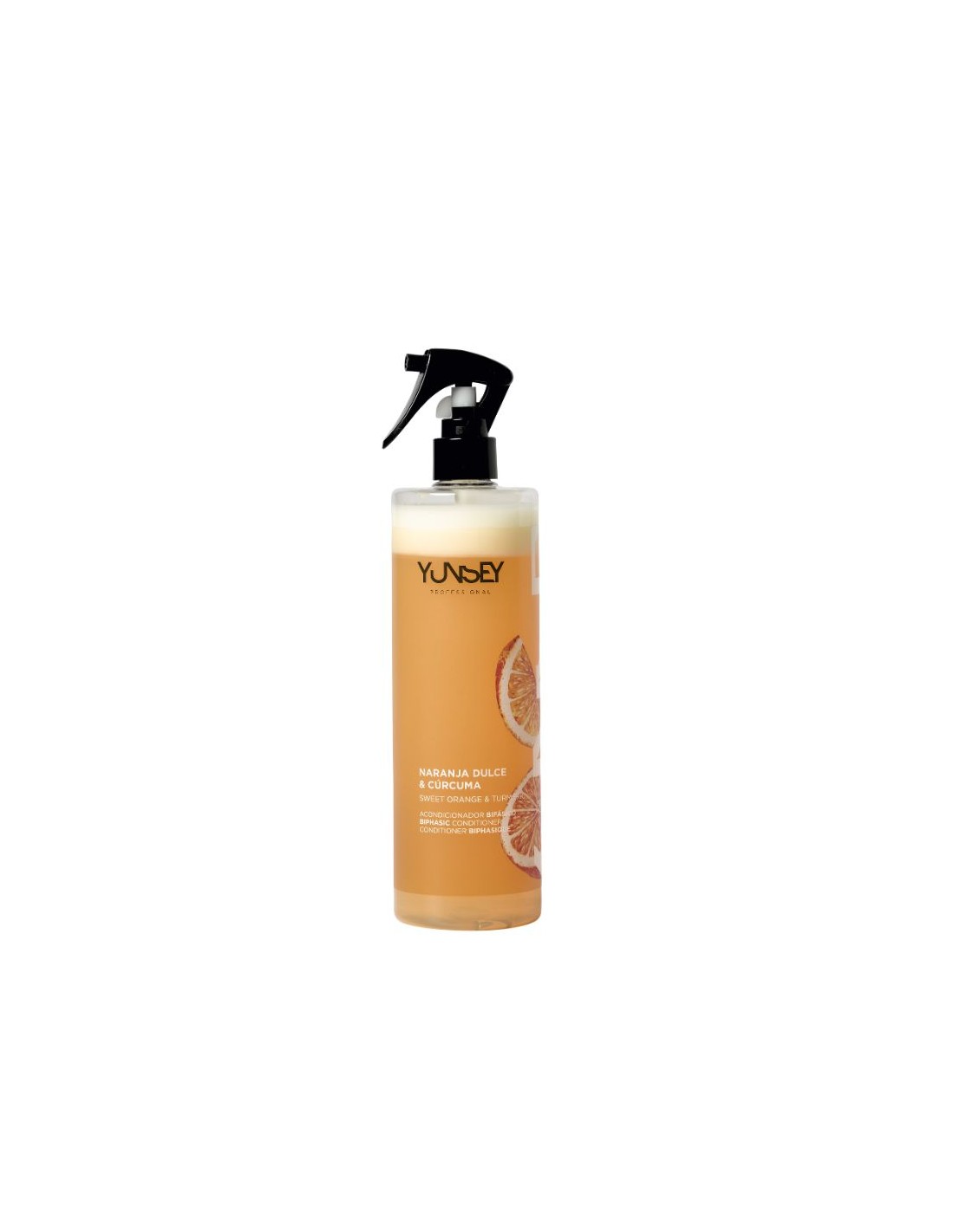 Acondicionador Bifasico Naranja Dulce y Cúrcuma 500 ml Yunsey de 2 fases. La fase superior mejora la parte externa del cabello, proporcionando brillo, suavidad y mejorando la peinabilidad, mientras que la fase inferior repara y nutre el interior del cabello.