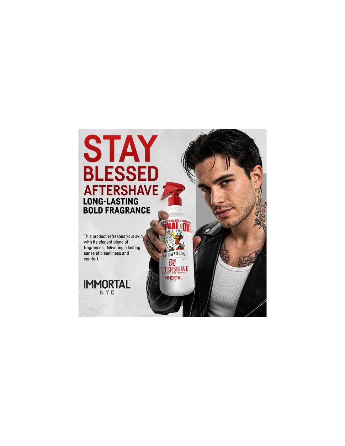 Colonia Stay Blessed 07 Aftershave 500 ml Immortal NYC. Eleve su rutina de aseo con Immortal NYC Stay Blessed Aftershave 07, un producto innovador donde la fragancia audaz se combina de manera excepcional con el cuidado de la piel. Este aftershave ha sido diseñado específicamente para el hombre moderno que no solo busca un buen afeitado, sino que también exige mucho más de su rutina diaria de cuidado personal. Con una fórmula de larga duración, este aftershave ofrece una refrescante explosión de masculinidad, al tiempo que cuida activamente su piel, haciendo que cada aplicación sea una experiencia revitalizante.