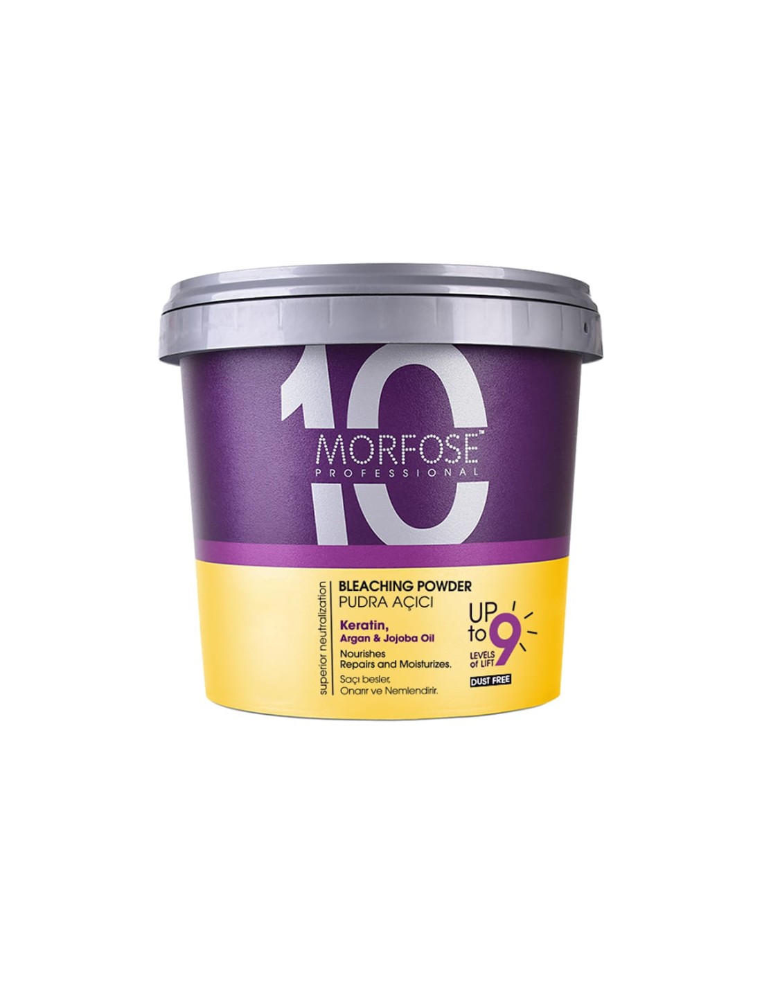 Decoloración 9 tonos Morfose 10. Polvo de decoloración de 600 gramos. La fórmula de Blue Dust-Free Bleaching Powder ha sido desarrollada con ingredientes puros y equilibrados, no volátiles que contienen microgránulos compactos. La fórmula exclusiva enriquecida con aceite de Argán, aceite de jojoba, keratina aclara el color de su cabello y actúa suavemente sobre los pigmentos naturales y la textura del cabello.